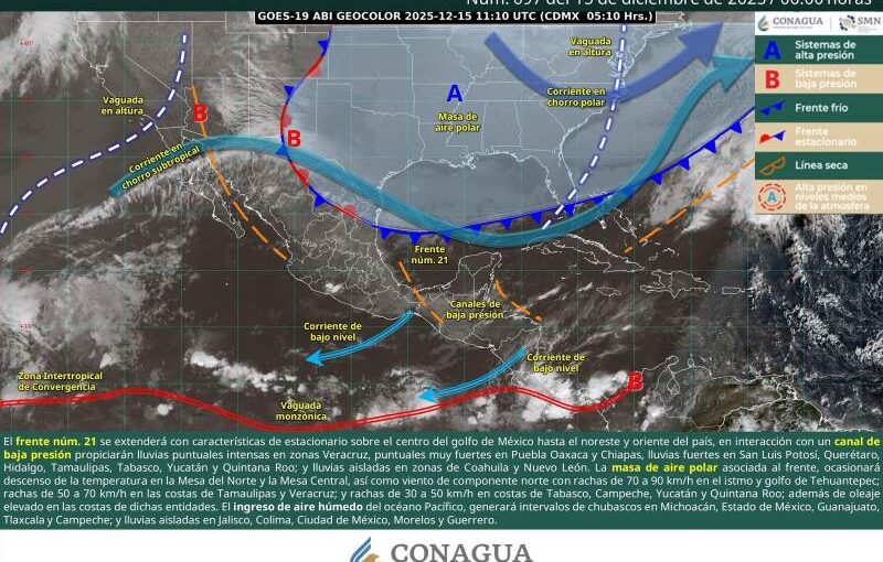 Lo anterior es ocasionado por el **frente frío número 21**, que se mantiene casi estacionario desde el centro del Golfo de México hasta el oriente del país.